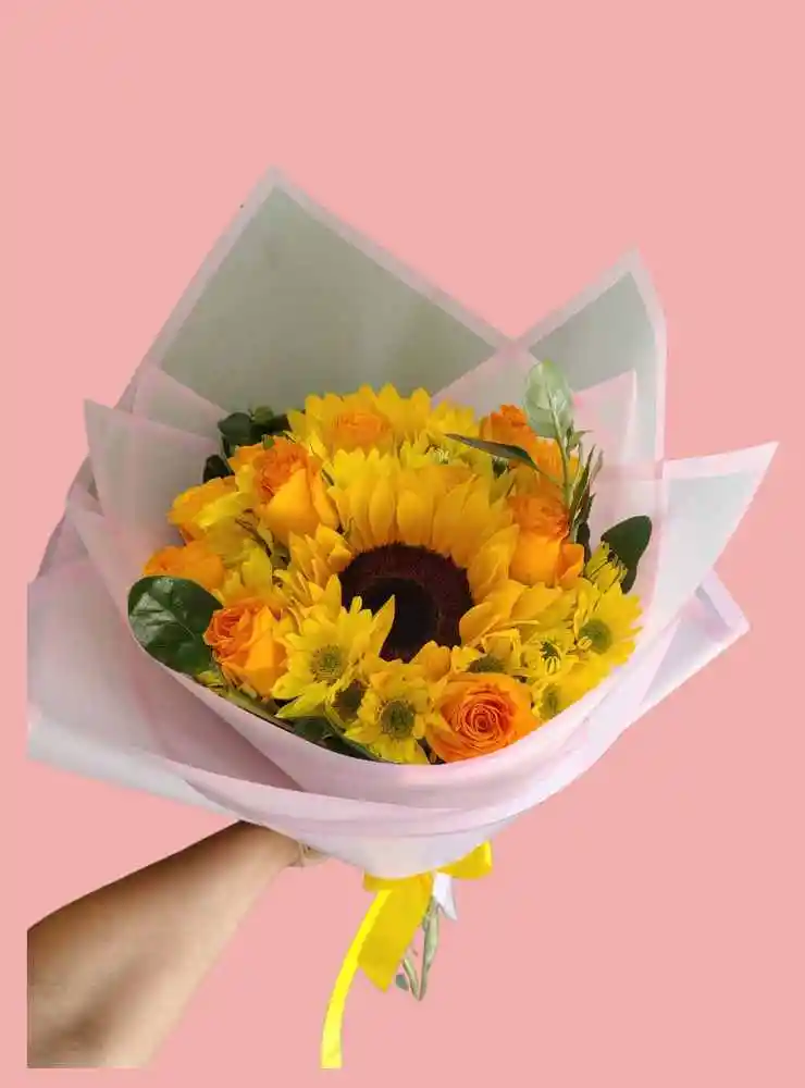 Ramillete Sol Amado es un arreglo floral luminoso y lleno de energía, diseñado para transmitir cariño y alegría a esa persona especial. Este ramo presenta una combinación de diferentes flores en la misma tonalidad. En el centro, se destaca un girasol de tamaño mediano, símbolo del sol y de la felicidad. Rodeando el girasol se encuentran rosas y margaritas en tonos amarillos y naranjas. El toque final es un delicado envoltorio con un papel que presenta dos tonalidades, blanco y durazno, atado con un listón amarillo, para que el regalo sea único. El arreglo incluye: Un girasol Rosas amarillas Margaritas amarillas Papel coreano Lazo amarillo