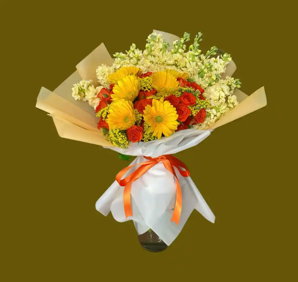 Bouquet "Sol Naciente" Este vibrante arreglo floral irradia calidez y energía desde el primer vistazo. Compuesto por gerberas amarillas de gran tamaño que evocan los primeros rayos del sol, mini rosas naranjas que aportan un toque de pasión y vitalidad, y delicados alelíes amarillos que suavizan el conjunto con su elegancia natural. "Sol Naciente" es un tributo a los nuevos comienzos, ideal para transmitir alegría, optimismo y entusiasmo. * Gerberas amarillas * Mini rosa anaranjada * Alelís Pos: Estamos sujetos a disponibilidad de flor, por lo tanto se pueden hacer cambios.