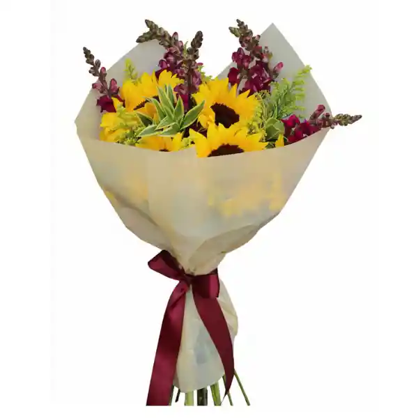 Bouquet con 6 girasoles, acompañado de toques de flores y follajes. Forrado en papeles finos