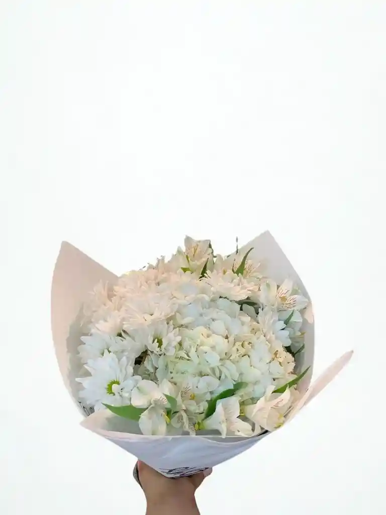 Bouquet con aprox. con 1 paquete de astromelia blanca , 2 varas de hortencias blancas y 1 paquete de margarita blanca . Nota: La flor puede ser sustituida dependiendo la disponibilidad de color y del producto “Mensaje Personalizado” máximo de 30 caracteres (Dejar el mensaje en el chat, los comentarios no se previsualizan para la tienda por lo que si se dejan allí no podrá ser incluido).