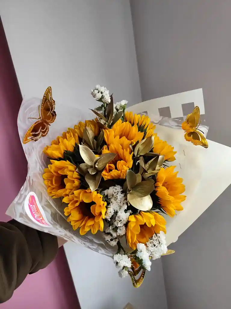 Bouquet de Girasoles con Follaje Decorativo Un radiante bouquet compuesto por girasoles frescos , símbolo de luz, energía y alegría. Acompañado de follaje que resalta su color vibrante y aporta un toque natural y armónico. Envuelto en un delicado papel coreano, cuidadosamente decorado para una presentación impactante y elegante. Incluye: *Tarjeta personalizada con dedicatoria *Decoración especial del bouquet *Recomendaciones para el cuidado de las flores *Sobrecito de alimento floral para prolongar su frescura El detalle perfecto para expresar amor, gratitud o celebrar una ocasión especial con estilo y elegancia. Nota importante: Por favor, deja el mensaje de dedicatoria y cualquier indicación adicional en el chat de la aplicación al momento de hacer tu pedido. Esto nos ayudará a personalizar tu arreglo con el mayor cuidado posible.