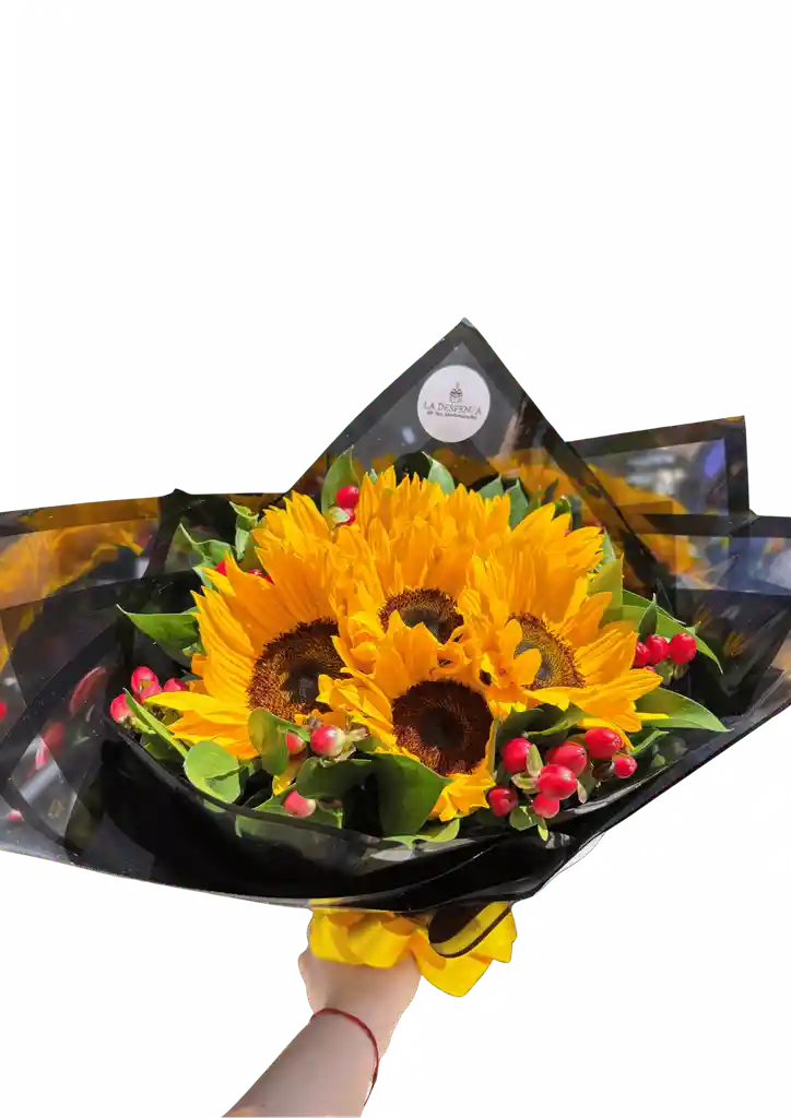 Bouquet elaborado con 6 girasoles acompañados de berries rojas y follaje fresco. Empacado en papel negro semimate y moño amarillo vibrante.