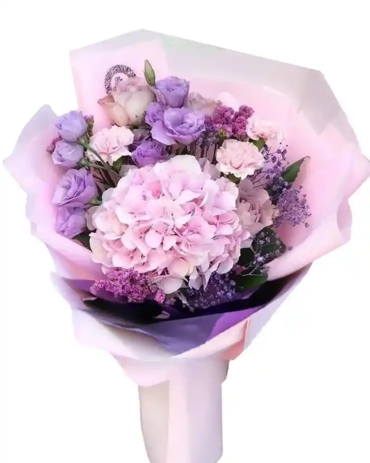 Bouquet morado de 1 hortencia, 10 rosas y 5 claveles con gypsophila morada Nota: La flor puede ser sustituida dependiendo la disponibilidad de color y del producto “Mensaje Personalizado” máximo de 30 caracteres (Dejar el mensaje en el chat, los comentarios no se previsualizan para la tienda por lo que si se dejan allí no podrá ser incluido).
