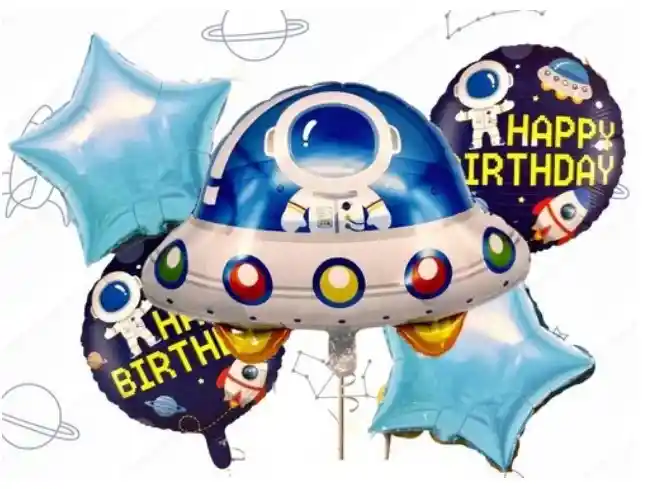 1 Bouquet temática espacio exterior astronauta nave espacial 60x52 cm 2 Globo circular metalizado temática espacial feliz cumpleaños o happy birthday 45 x 45 cm 2 Globo estrella azul metalizada 45 x 45 cm 1 pitillo para inflar globos *Los globos se entregan desinflados