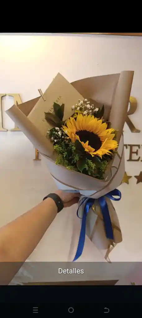 1 girasol, rusco, gipsofilia y mensaje personalizado