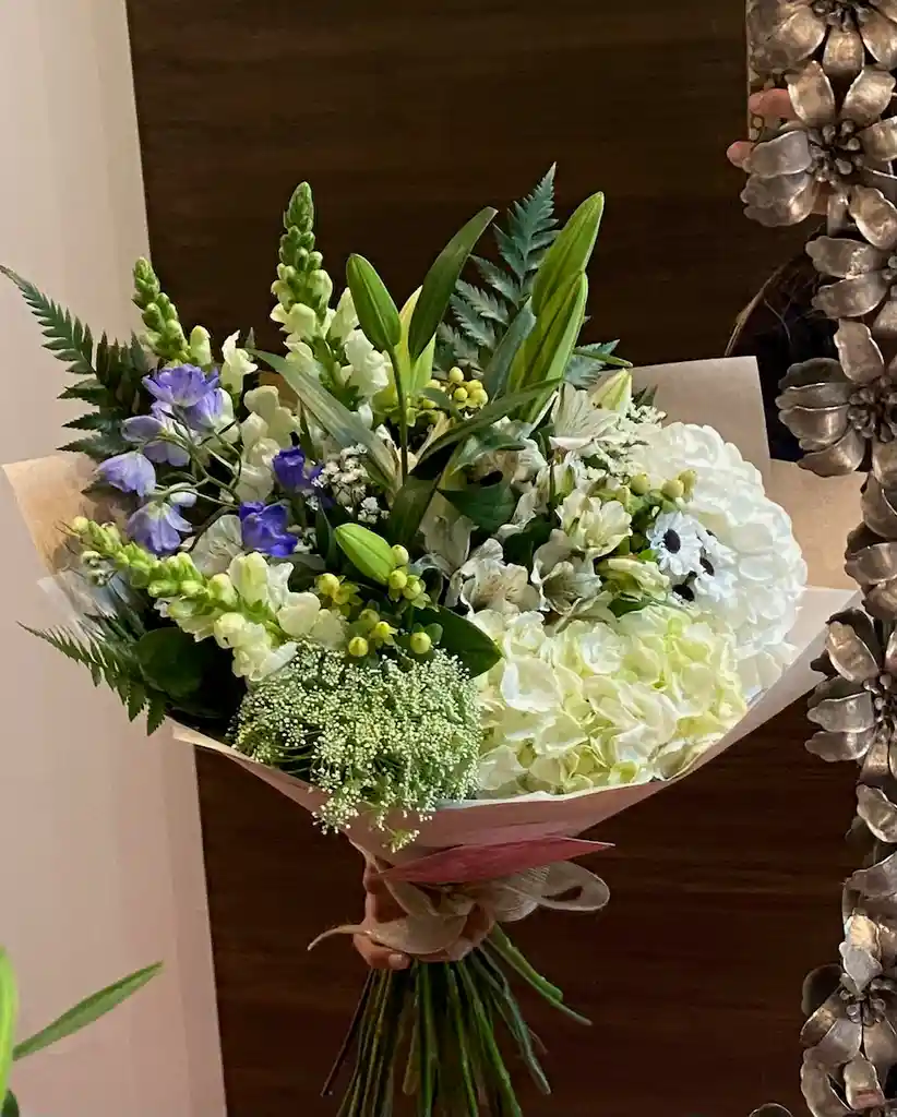 Bouquet en tonos blancos, con toques de colores suaves, diseñado especialmente para fechas de condolencias o pésame. *Imágenes de referencia. Las variedades y colores de las flores pueden variar según disponibilidad en tienda. En caso de tener requerimientos específicos, dejarlos en los comentarios.