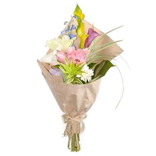 Bouquet en flores tropicales, lirios, gerberas y cartuchos (Seleccionar color según existencia) con papleres de la marca Catalina Bojanine y moño de yute.