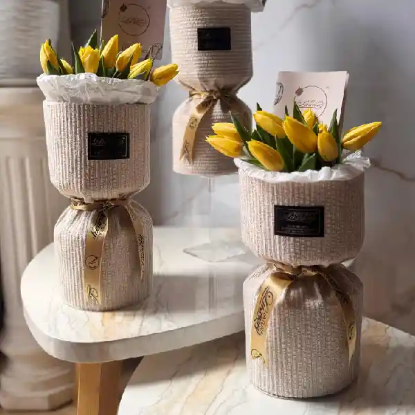 🌷 Tulipanes Holandeses Elegante arreglo con 10 tulipanes frescos, presentados en un jarrón de lujo recubierto con tela fina