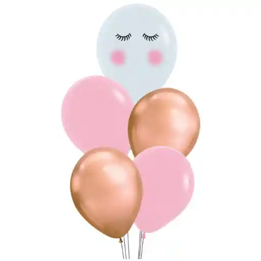 "Bouquet sencillo de 5 globos en helio. Incluye: - 2 globos oro rosa en látex - 2 globos rosado pastel en látex - 1 globo blanco de látex con estampado de Unicornio - Pesa sencilla Todos los globos contienen helio y gel de larga duración (3 días de duración). "