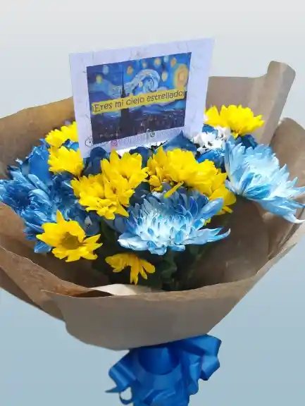 Boquet en pompones de colores azul y amarillo simulando famosa obra de este reconocido Artista