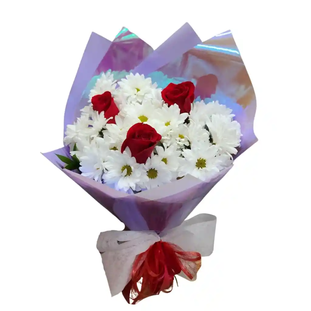 Hermoso bouquet de margaritas con rosas y con moño decorativo, perfecto para toda ocasión.