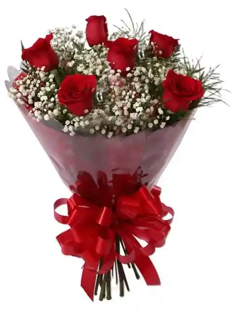 Bouquet de 6 rosas rojas con 7 varas de gipsoLa flor puede ser sustituida dependiendo la disponibilidad de color y del producto “Mensaje Personalizado” máximo de 30 caracteres (Dejar el mensaje en el chat, los comentarios no se previsualizan para la tienda por lo que si se dejan allí no podrá ser incluido)