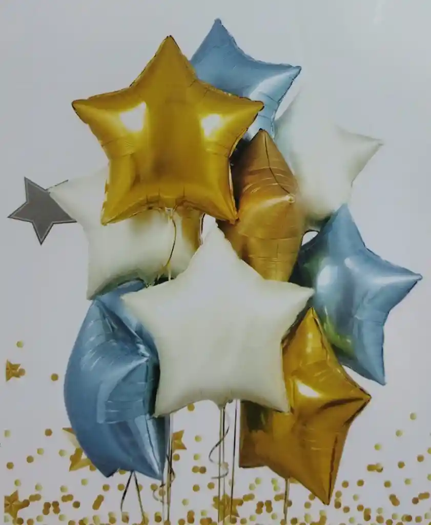 Bouquet x 10 Globos Metalizados Estrellas •4 Globos Estrella Blanco/45x45cm •3 Globos Estrella Dorado 45x45cm •3 Globos Estrella Azul 45x45cm