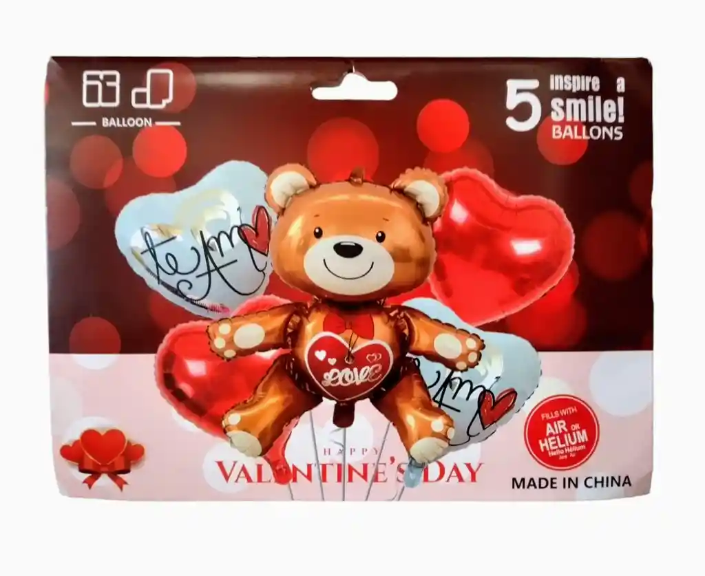 Bouquet x 5 Globos 3d Metalizados de Oso Te amo •1 Globo Metalizado Oso 60x64cm •2 Globo corazón metalizado rojo 45x45cm •2 Globo corazón metalizado te amo 45x45cm puede llegar en blanco o rojo dependiendo la disponibilidad •1 Pitillo para inflar globos