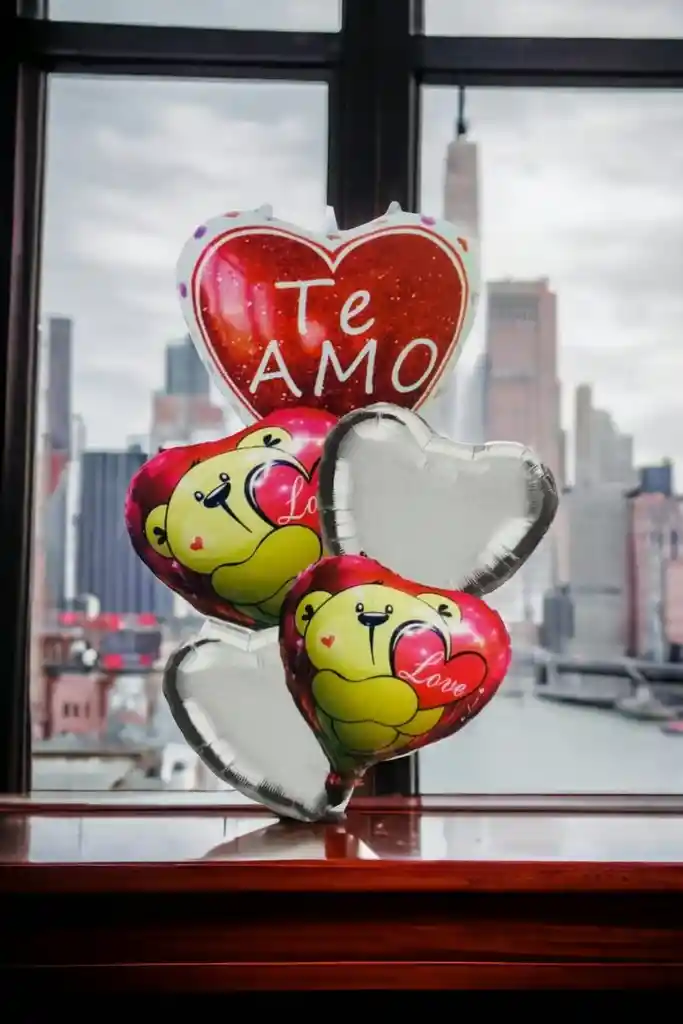 Bouquet x 5 Globos Metálicos Corazón TE AMO Set de 5 Globos Metálicos •1 Globo Corazón 65cm x 60 cm •2 Globos Corazón Impreso 45 cm x 45 cm •2 Globos Corazón 45 cm x 45 cm Se puede inflar con helio o con aire. Se venden desinflados