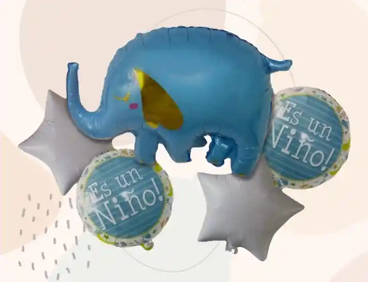 Set de 5 Globos Metalizados Baby Shower Niño •1Globo Elefante Azul 65cm x 55 cm •2 Estrellas de 45cm •2 Globos Redondos de 45cm Se pueden inflar con helio o con aire. Se venden desinflados.