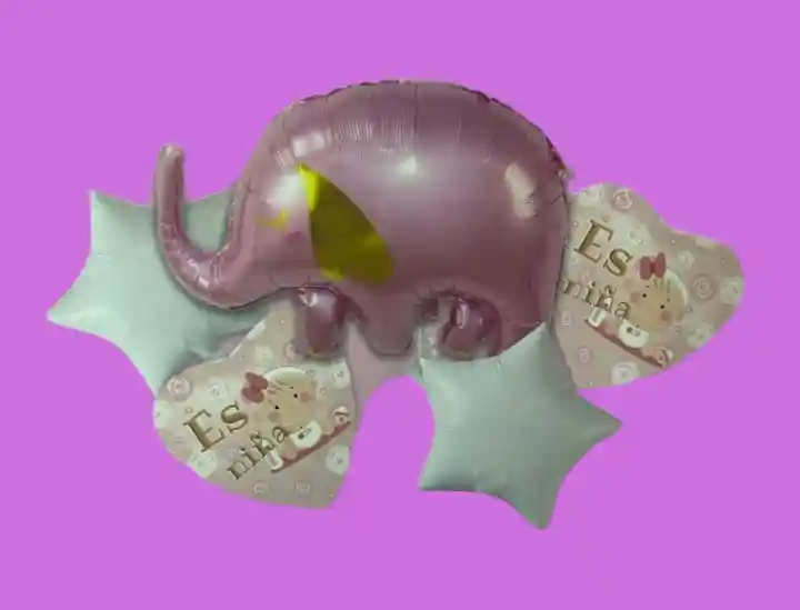 Bouquet X5 Globos Metálizados Elefante Rosado Por tu Compra llevas: •1 Globo Elefante Rosado 85x70cm •2 Globos Estrellas Blancas 45x45cm •2 Globos Corazones Es una Niña 45x45cm NOTA: •Los Globos se pueden inflar con Helio * Los Globos Se envían Desinflados