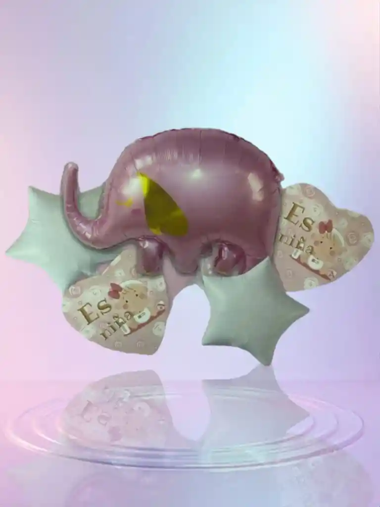 Bouquet X5 Globos Metálizados Elefante Rosado Por tu Compra llevas: •1 Globo Elefante Rosado 85x70cm •2 Globos Estrellas Blancas 45x45cm •2 Globos Corazones Es una Niña 45x45cm NOTA: •Los Globos se pueden inflar con Helio * Los Globos Se envían Desinflados