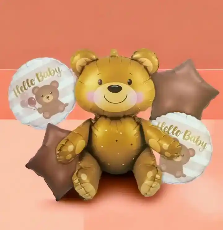 Bouquet x 5 Globos Metalizados Baby Shower Oso Café Por la compra llevas: •1 Globo Oso Café MEDIDAS:65x65cm •2 Globos Redondos MEDIDAS:45x45cm/Cada uno •2 Globos Estrellas MEDIDAS:45x45cm/Cada uno •Se pueden inflar con Helio •Los Globos se entregan desinflados