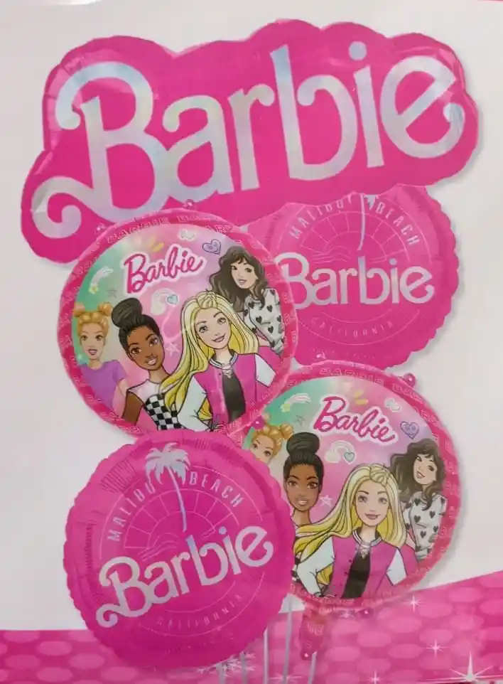 Bouquet x 5 Globos Metalizados Barbie Por la compra llevas: •1 Globo Grande con la palabra BARBIE MEDIDAS:98x60cm •4 Globos Redondos MEDIDAS:45x45cm/Cada uno •Se pueden inflar con Helio •Los Globos se entregan desinflados