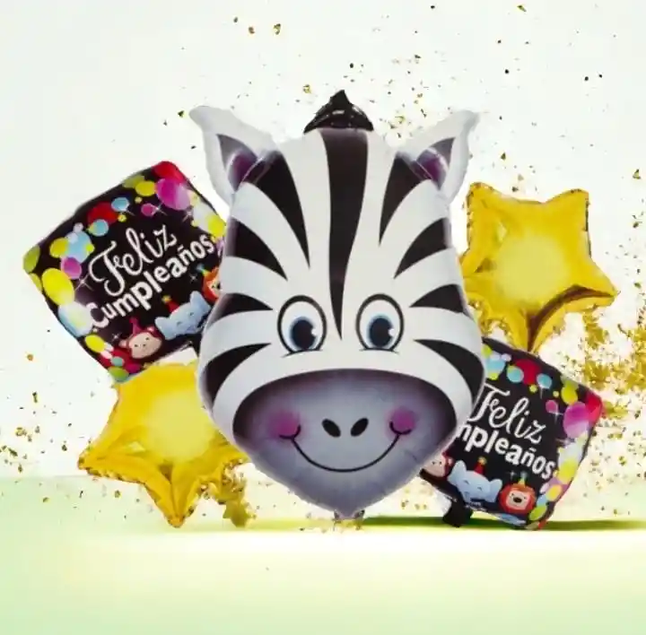 Bouquet x 5 Globos Metalizados Zebra Feliz Cumpleaños •1 Globo cebra:75cm •2 Globos Estrella: 45cm (Cada uno) •2 Globos Cuadrados: 45cm (Cada uno) •Se puede inflar con Helio
