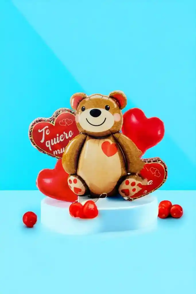 Bouquet x 5 Globos Metalizados Corazón TE QUIERO MUCHO Set de 5 Globos Metalizados •1 Globo Oso Café 3D 91cm x 67 cm •2 Globos Corazón Estampado 45 cm x 45 cm •2 Globos Corazón de 45 cm x 45 cm Se pueden inflar con helio o con aire. Se venden desinflados