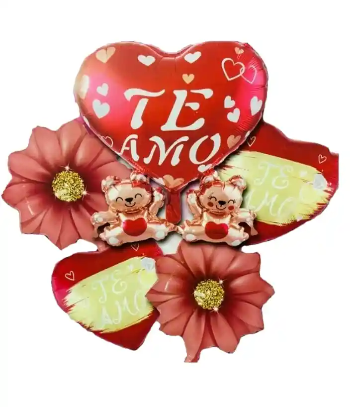 Bouquet x 5 Globos Metalizados Corazón TE AMO flores •1 Globo Corazón TE AMO + 2 Ositos /75cm x 50 cm •2 Globos Corazón de 45cm •2 Globos Flor de 45cm Se pueden inflar con helio o con aire. Se venden desinflados.