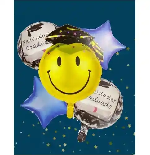 Set Globos Metalizados de Grados x5 unidades CONTENIDO: •1 Globo Metalizado en forma de Carita Feliz / 48 x 48cm •2 Globos metalizados en forma de Estrella 45cm •2 Globos metalizados Redondo Estampado 45cm