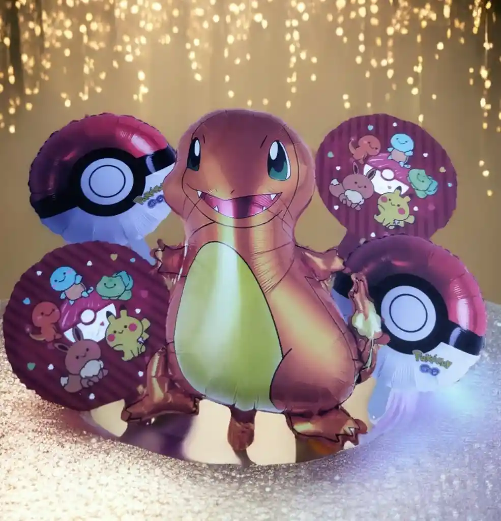 BOUQUET GLOBOS METALIZADOS DINOSAURIO POKÉMON / 5 PIEZAS • 1 Globo DINOSAURIO POKÉMON : 70 cm • 4:Globos Redondo 45*45cm/Cada uno •Se pueden inflar con Helio o con aire. •Se venden desinflados.