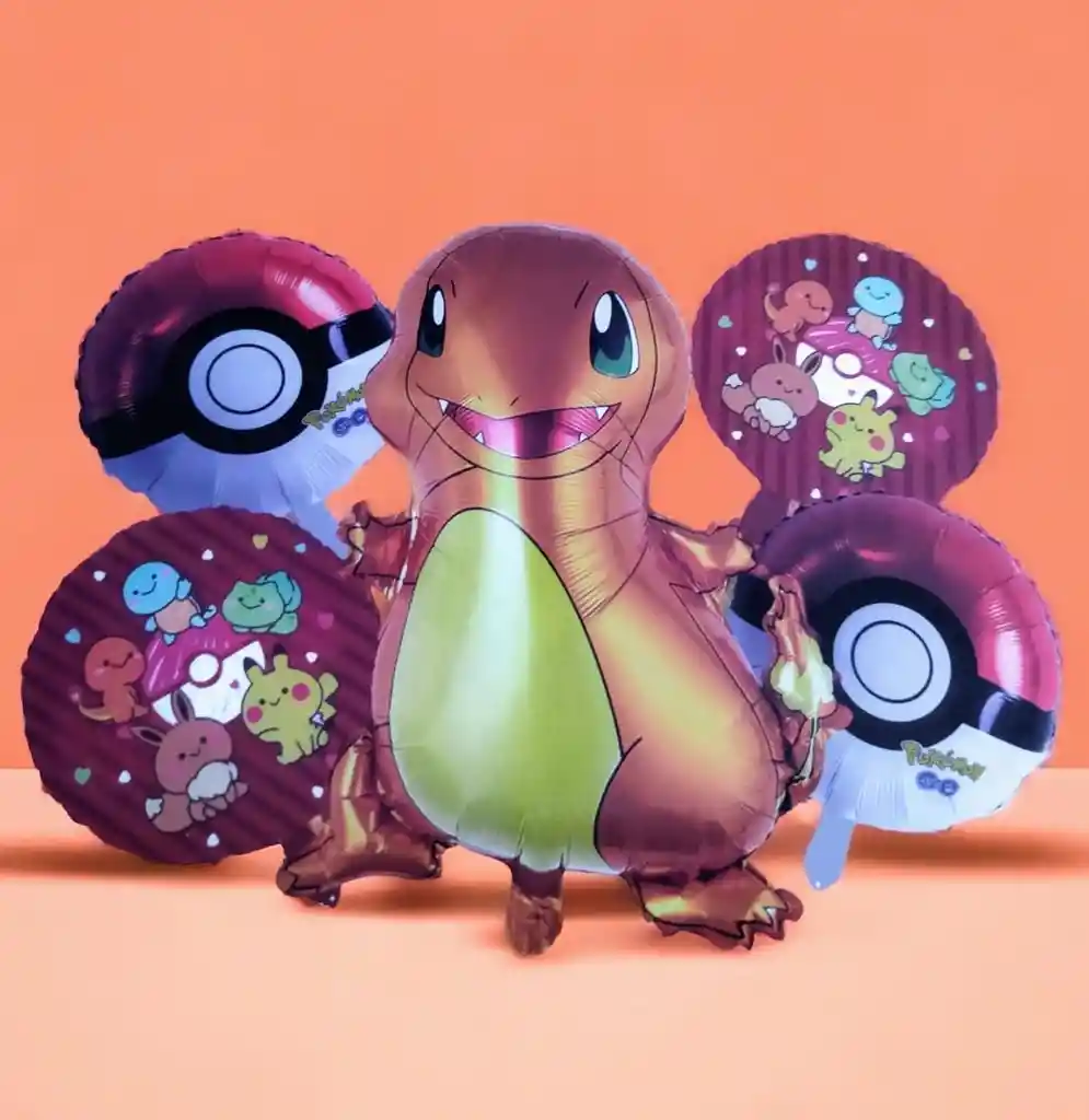 BOUQUET GLOBOS METALIZADOS DINOSAURIO POKÉMON / 5 PIEZAS • 1 Globo DINOSAURIO POKÉMON : 70 cm • 4:Globos Redondo 45*45cm/Cada uno •Se pueden inflar con Helio o con aire. •Se venden desinflados.