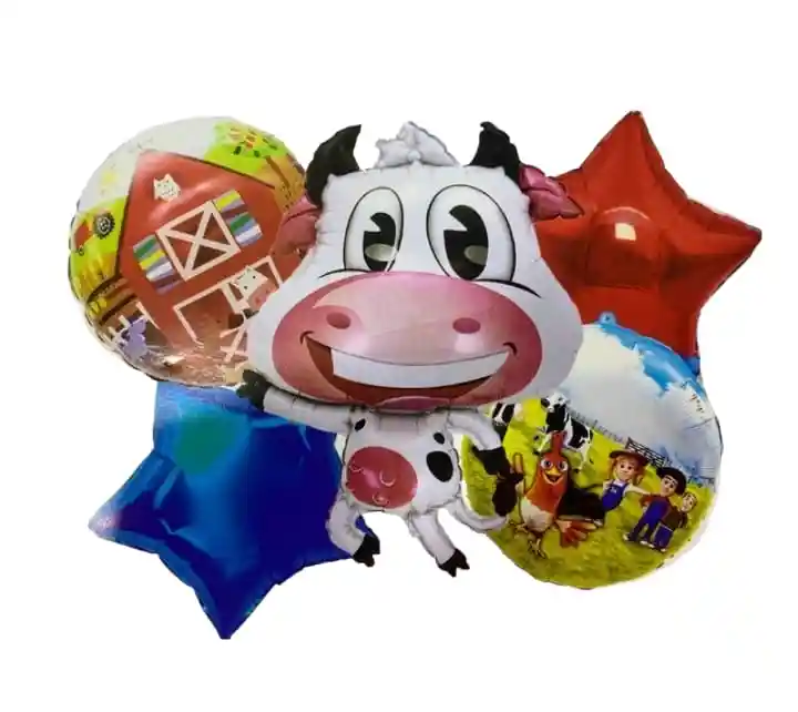 Bouquet x 5 Globos Metalizados LA GRANJA DE ZENON vaca Lola Set de 5 Globos Metalizados LA GRANJA DE ZENON •1Globo VACA 75cm x 50 cm •2 Globos Estrella de 45cm •2 Globos Redondos de 45cm Se pueden inflar con helio o con aire. Se venden desinflados.
