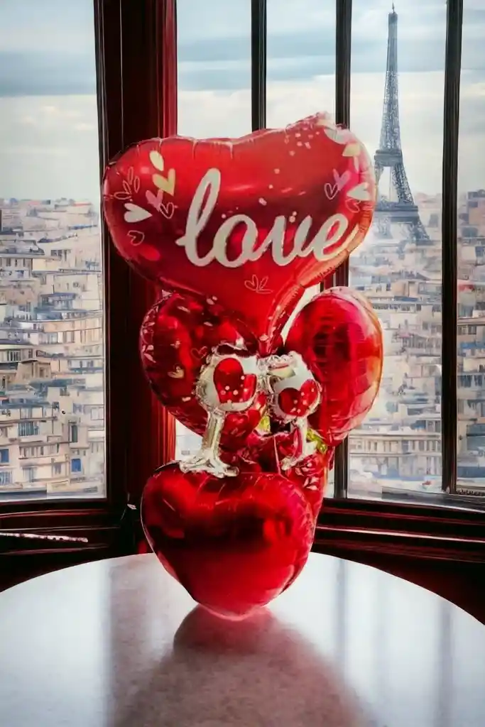 Set de 5 Globos Metalizados LOVE Corazones •1 Globo Corazón 52cm x 50 cm •3 Globos Corazón de 45cm •2 Globos Copas Se pueden inflar con helio o con aire. Se venden desinflados