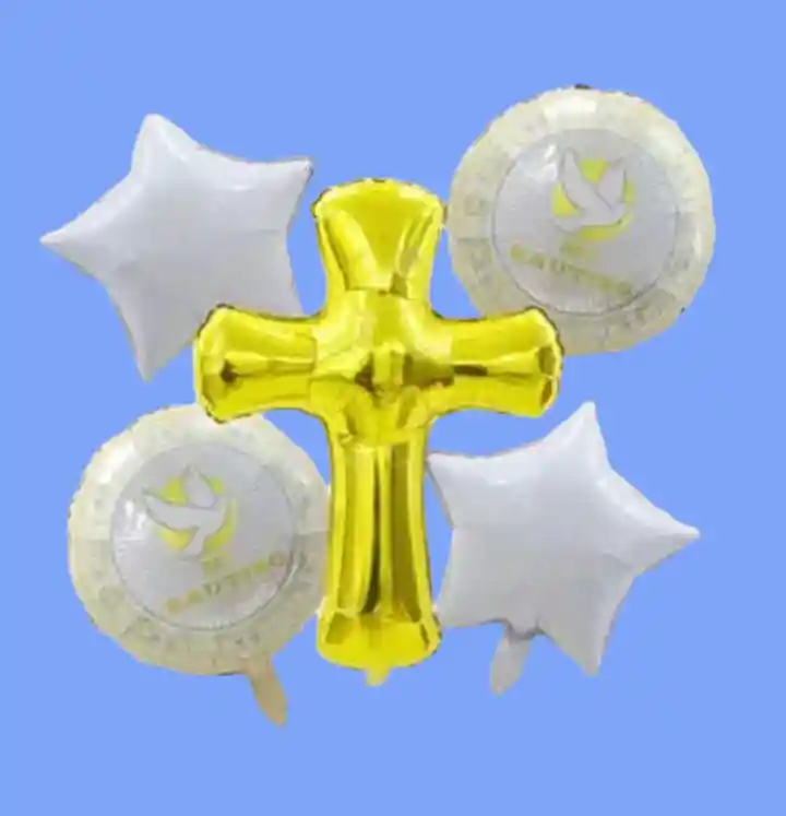 Descripción: Hermosos globos de Cruz para Bautizo, Pascua, Ceremonias, etc. Detalle Pack: • 2 Globos metalizados redondos diseño de Cruz de 45cm c/u. • 2 Globos metalizados de estrella color rosado de 45cm c/u. • 1 Globo metalizado de cruz color rosado de 75x51 cm. Tipo Inflado: Globos se pueden inflar con Aire ó Helio.