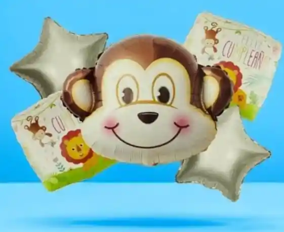 Bouquet x 5 Globos Metalizados Mono Feliz Cumpleaños •1 Globo Mono:75cm •2 Globos Estrella: 45cm (Cada uno) •2 Globos Cuadrados: 45cm (Cada uno) •Se puede inflar con Helio