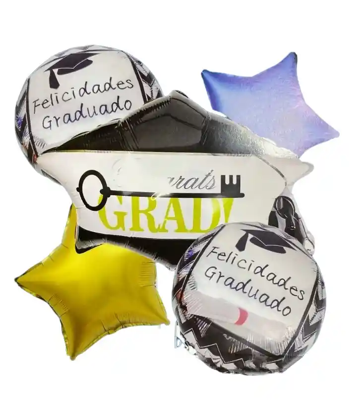 Bouquet x 5 Globos Metalizados Para Grado Set Globos Metalizados de Grados x5 unidades CONTENIDO: •1 Globo Metalizado en forma de Estrella estampada "Congrats Grad" de 48 x 48cm •2 Globos metalizados en forma de estrella estampadas de 45cm •2 Globos metalizados en forma de estrella de 45cm