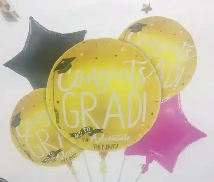 Descripción Set x 5 Globos Metalizados Decoración para Grado Contiene: •1 Globo Metalizado Grande marcado Congrats Grad: 56cm •2 Globos metalizados de: 45cm, (cada uno) marcados Congrats Grad •2 Estrellas Metalizadas 1 color negro, 1 Fucsia de 45cm (cada uno) Importante: Los globos se envían sin inflar