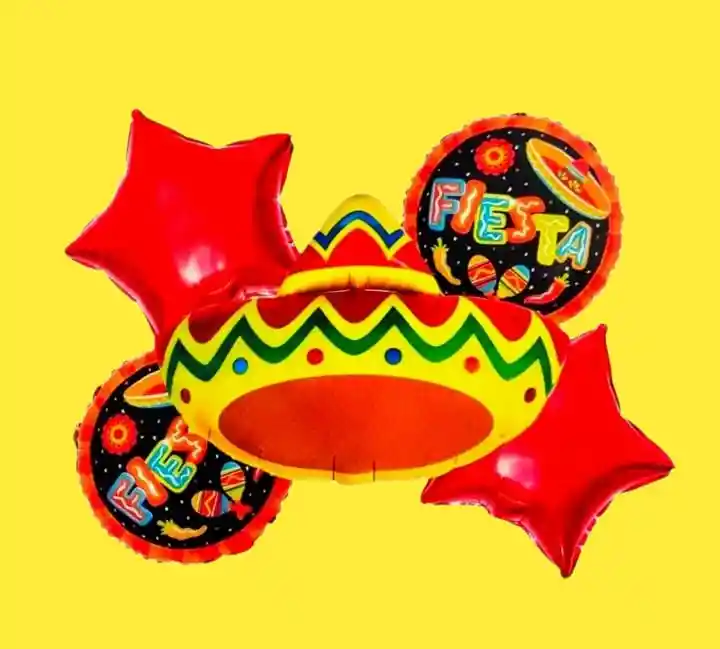 Set de 5 Globos Metalizados •1 Globo Sombrero Mexicano 80cm x 60 cm •2 Globos Estrellas 45 cm x 45 cm •2 Globos Redondo de 45 cm x 45 cm Se pueden inflar con helio o con aire. Se venden desinflados