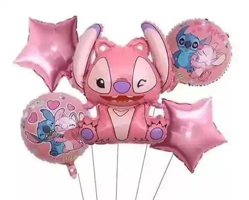 1 Globo Metalizado Angel Rosada Stitch 60cm 2 Globo Metalizado circular temática Angel y Stitch 45x45 cm 2 Globo Metalizado corazon rosado 45x45cm 1 pitillo para inflar globos *Los globos se entregan desinflados ¡ATENCIÓN! PELIGRO DE ASFIXIA. Los niños menores de ocho años pueden asfixiarse o sofocarse con globos sin inflar o rotos. Es necesaria la vigilancia de una persona adulta. Mantén los globos sin inflar fuera del alcance de los niños. Desecha inmediatamente los globos rotos.