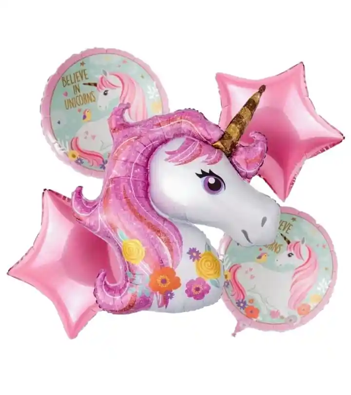 Bouquet globos metalizados blanco y rosa Unicornio Materiales de alta calidad: los globos están hechos de película de aluminio de alta calidad que es seguro y no tóxico. Brillo metálico y color uniforme. Contiene 2 globos estrella rosa 2 globos redondos fondo unicornio 1 globo silueta Unicornio