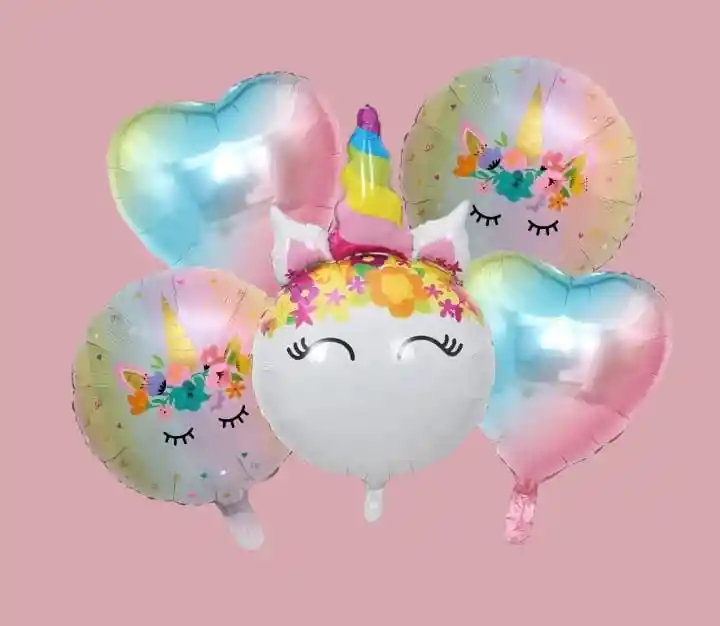 Bouquet X5 Globos Metálizados Unicornio Por tu Compra llevas: •1 Globo Unicornio 55x75cm •2 Globos Corazón 45x45cm •2 Globos Redondo Diseño Del Unicornio 45x45cm NOTA: •Los Globos se pueden inflar con Helio * Los Globos Se envían Desinflados
