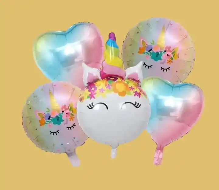 Bouquet X5 Globos Metálizados Unicornio Por tu Compra llevas: •1 Globo Unicornio 55x75cm •2 Globos Corazón 45x45cm •2 Globos Redondo Diseño Del Unicornio 45x45cm NOTA: •Los Globos se pueden inflar con Helio * Los Globos vienen Desinflados