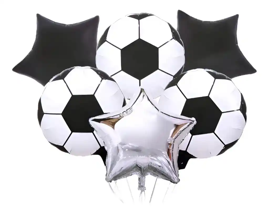 Bouquet X 6 Globos Metalizados Balones Futbol Por tu Compra llevas: •3 Globos Estrellas 45x45cm •3 Globos Balones de Fútbol 45x45cm NOTA: •Los Globos se pueden inflar con Helio •Los Globos Se envían Desinflados