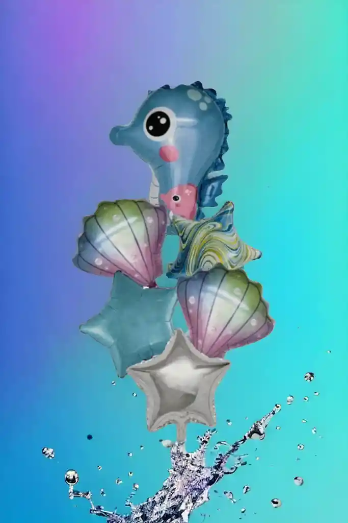 Bouquet x 6 Globos Metalizados Caballito de Mar Azul •1 Globo Caballito de Mar 90cm x 67 cm •3 Globos Estrella 45 cm x 45 cm •2 Globos Concha de Mar/ 45 cm x 45 cm Se pueden inflar con helio o con aire. Se venden desinflados.