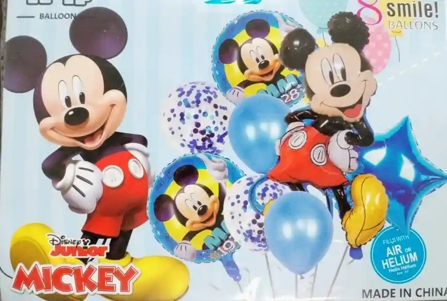Bouquet X 8 Globos Metalizados Y Latex Mickey Mouse Por tu Compra llevas 4 Globos Metalizados y 4 Globos Latex •1 Globo Mickey Mouse Metalizado 70X50cm •1 Globo Estrella 45X45cm •2 Globos Metalizados Estampado •4 Globos Latex Nota: •Los Globos se entregan desinflados •Son Aptos para inflar con Helio