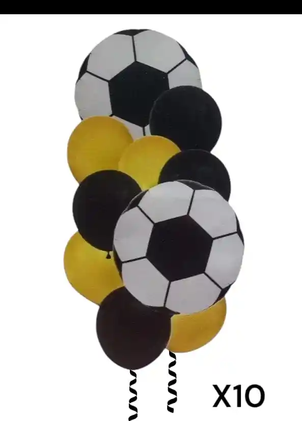 Bouquet X10 Globos Por tu Compra llevas: •2 Globos Balones de Fútbol 45x45cm •8 Globos Látex Negro y Dorado 30x30cm Cada Globo NOTA: •Los Globos se pueden inflar con Helio •Los Globos Se envían Desinflados