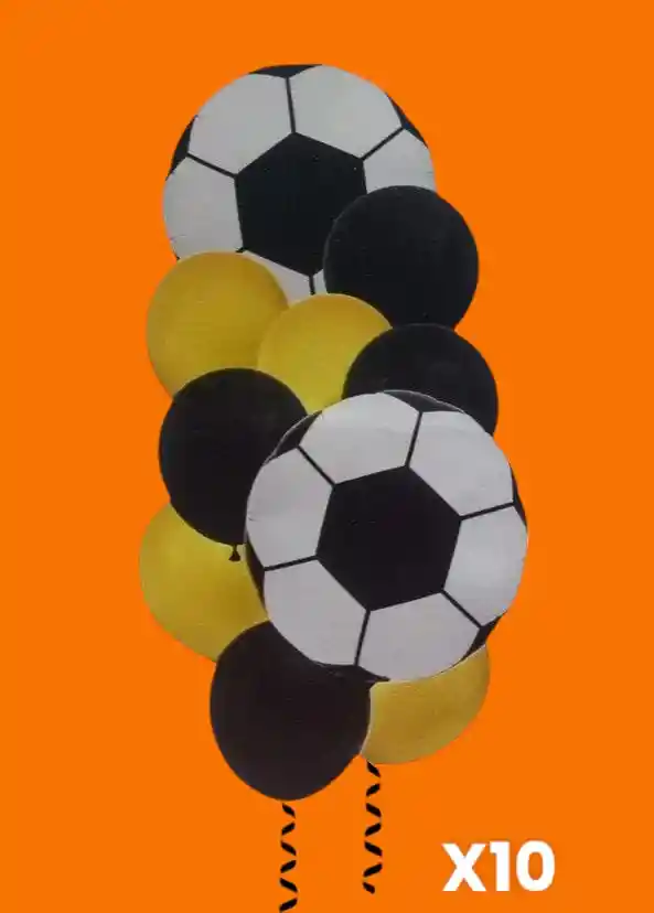 Bouquet X10 Globos Por tu Compra llevas: •2 Globos Balones de Fútbol 45x45cm •8 Globos Látex Negro y Dorado 30x30cm Cada Globo NOTA: •Los Globos se pueden inflar con Helio •Los Globos Se envían Desinflados