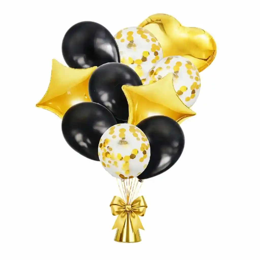Este hermoso bouquet incluye 10 globos Látex y Metalizados en tonos negros y dorados, con globos transparentes llenos de confites dorados para darle un toque especial. Ideal para dar un toque elegante y festivo a tu celebración. ¡Perfecto para cualquier evento que requiera un diseño sofisticado y llamativo! Vienen: •2 Globos estrellas metalizadas Doradas: 45x45 cm •1 Globo Corazón Metálizado dorado: 45x45 cm •4 Globos Látex en color Negro: R12 •3 Globos en color Transparente con confites dorados: R12 Tener en Cuenta: •Los globos vienen desinflados •El porta globos dorado con moño que aparece en la imagen es solo para fines decorativos y no está incluido.