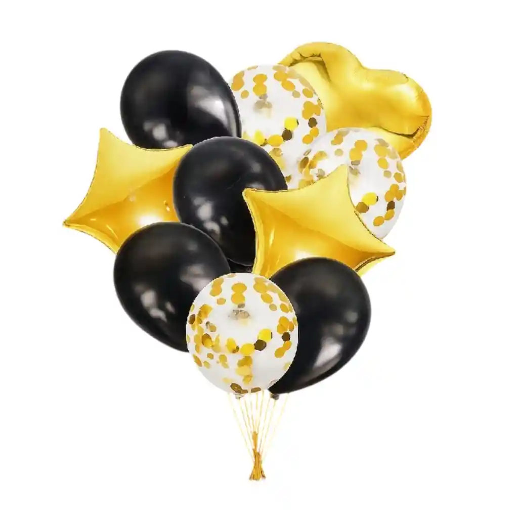 Este hermoso bouquet incluye 10 globos Látex y Metalizados en tonos negros y dorados, con globos transparentes llenos de confites dorados para darle un toque especial. Ideal para dar un toque elegante y festivo a tu celebración. ¡Perfecto para cualquier evento que requiera un diseño sofisticado y llamativo! Vienen: •2 Globos estrellas metalizadas Doradas: 45x45 cm •1 Globo Corazón Metálizado dorado: 45x45 cm •4 Globos Látex en color Negro: R12 •3 Globos en color Transparente con confites dorados: R12 Tener en Cuenta: •Los globos vienen desinflados •El porta globos dorado con moño que aparece en la imagen es solo para fines decorativos y no está incluido.