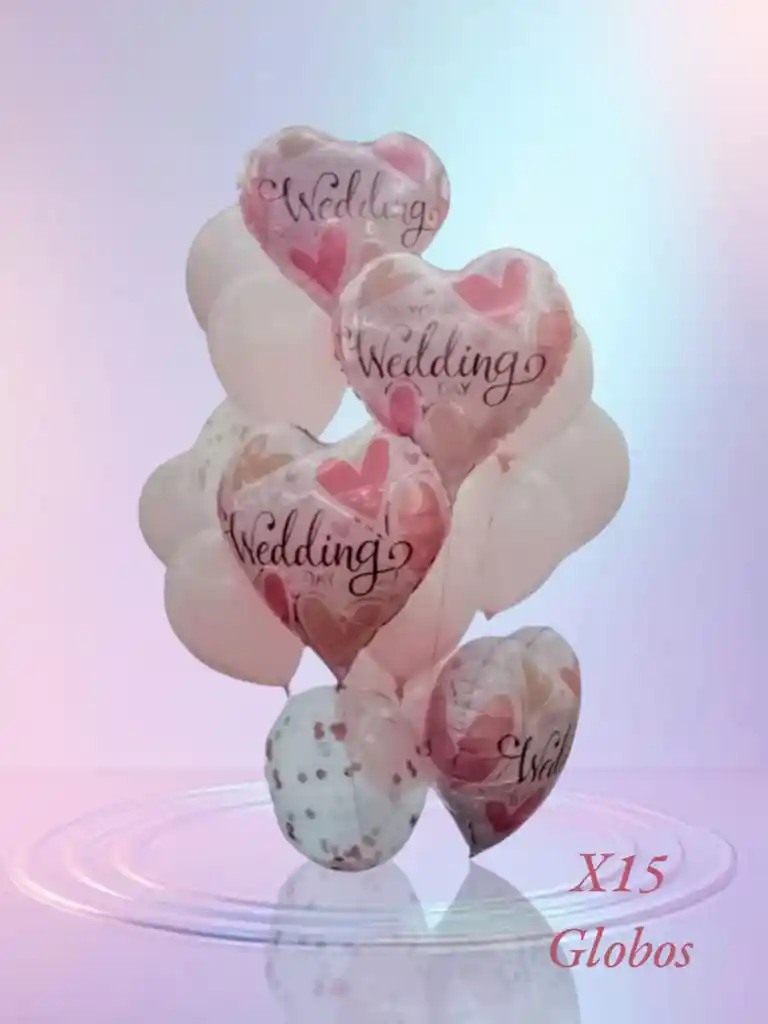 Bouquet X15 Globos Por tu Compra llevas: •4 Globos Metálizados Corazón "NUESTRA BODA" 45X45 cm (cada globo) •2 Globos Transparente con serpentina R12 •9 Globos Látex Rodado R12 NOTA: •Los Globos se pueden inflar con Helio •Los Globos Se envían Desinflados