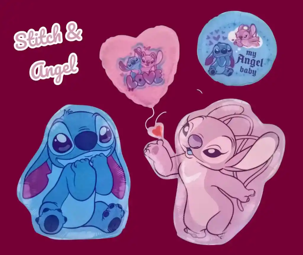 Bouquet X4 Globos Metálizados Stitch y Angel •1 Globo Angel 60x67cm •1 Globo Stitch 62x48cm •1 Globo Redondo 45x45cm •1 Globo Corazón 45x45cm Nota: •Los Globos vienen desinflados •Se pueden inflar con Helio